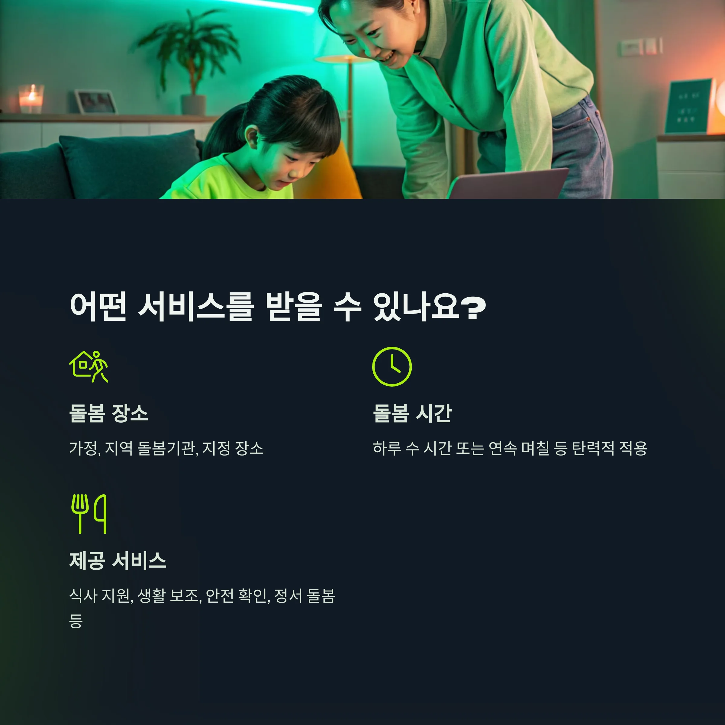 | 제공 서비스 | 식사 지원, 생활 보조, 안전 확인, 정서 돌봄 등 |