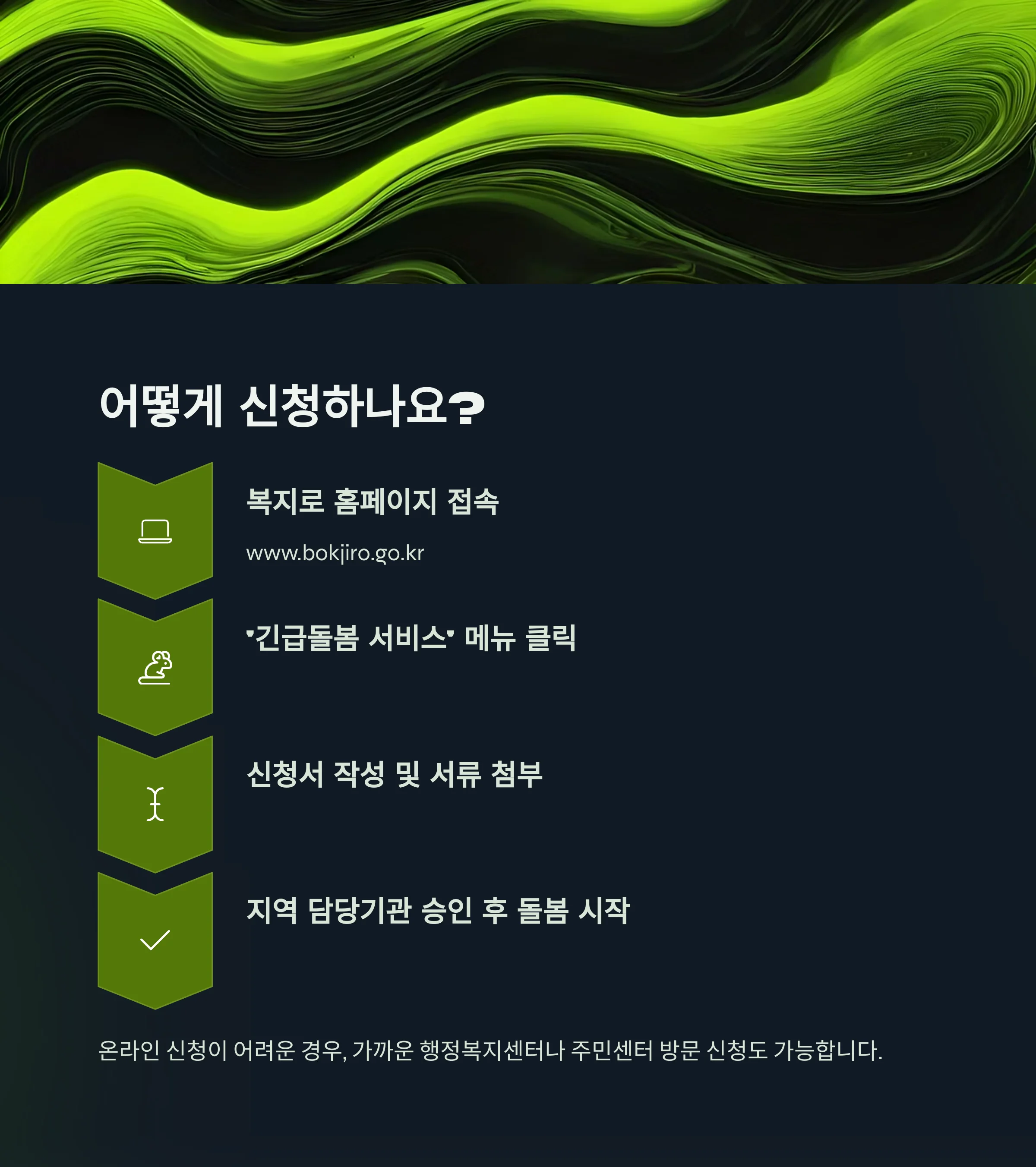 가까운 행정복지센터나 주민센터를 통한 방문 신청도 가능합니다.