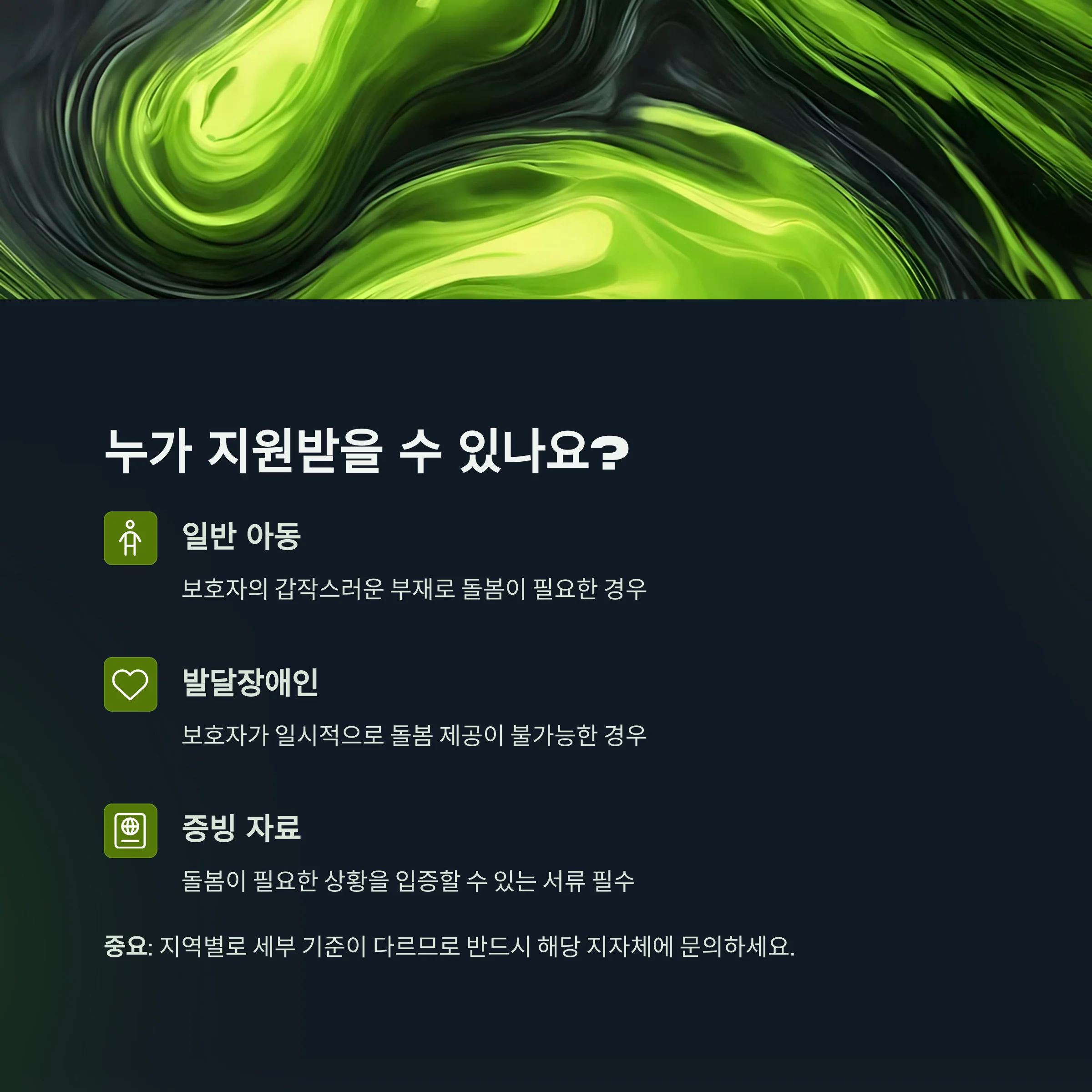 | 보호자 조건 | 질병, 사고, 경조사, 정신적 소진 등으로 돌봄이 곤란한 상태 |