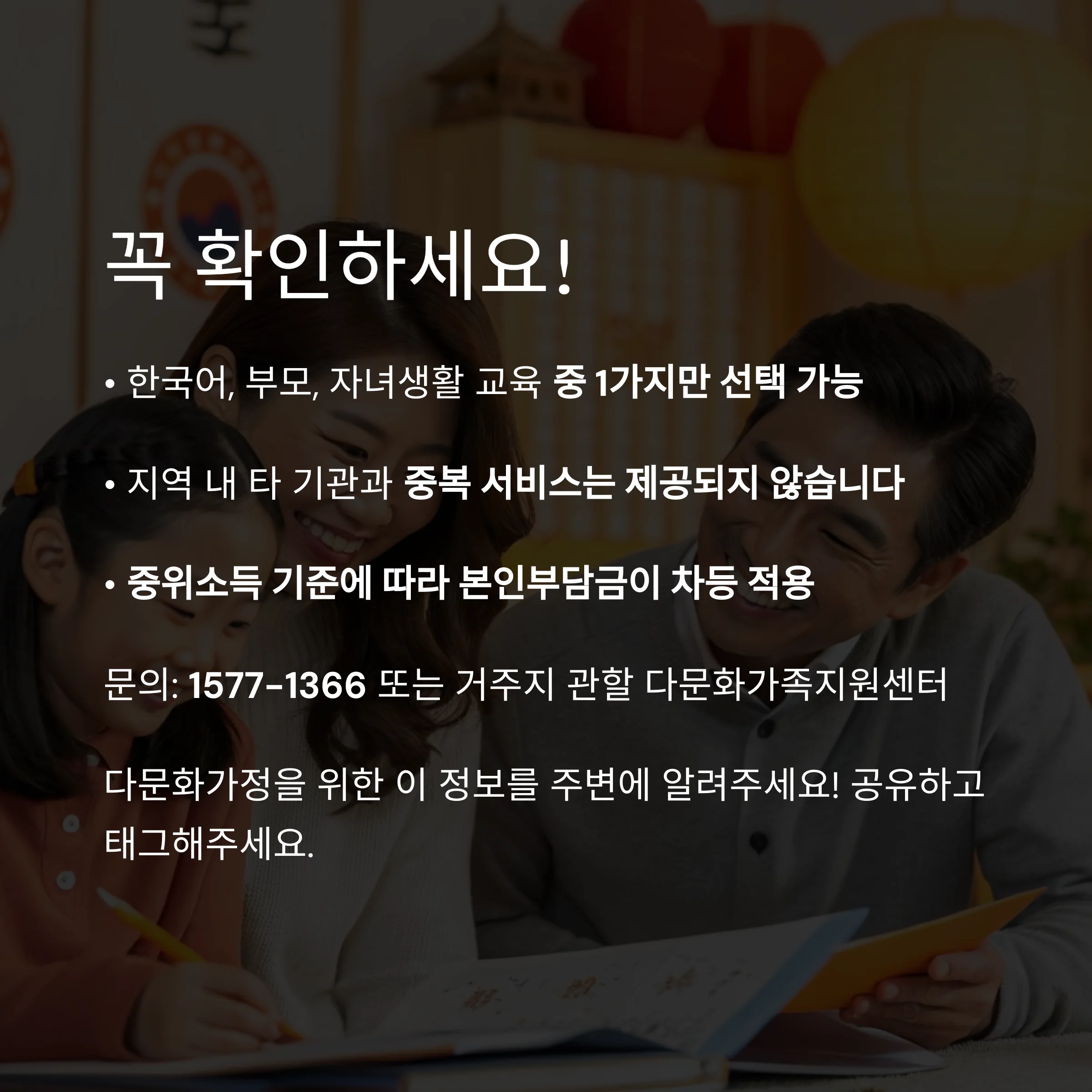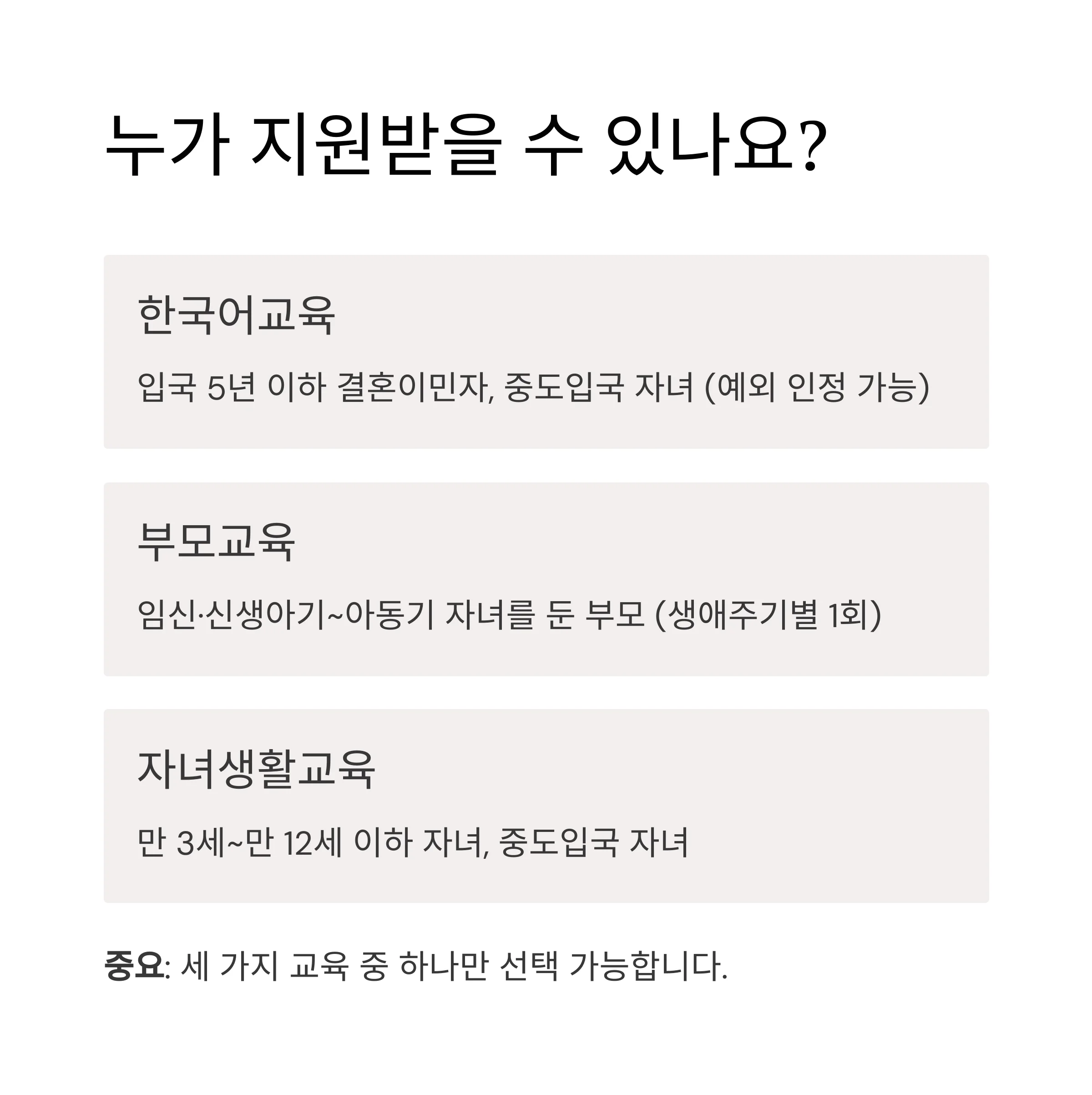 • 한국어, 부모, 자녀생활 교육 중 1가지만 선택 가능